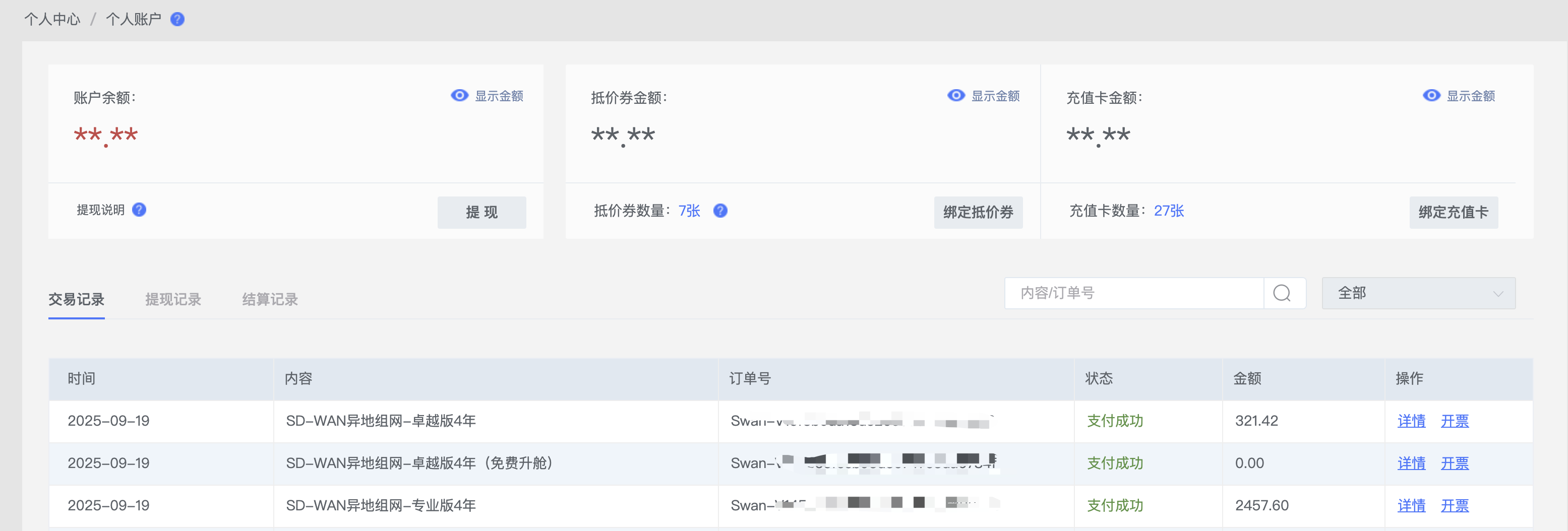 展示账户余额、抵价券金额、充值卡金额以及交易记录、提现记录、结算记录